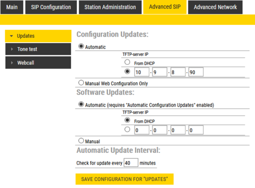 When used in SIP mode, an IP station may be set up to automatically pull configuration from a TFTP server. The IP address of this TFTP server can be obtained using DHCP procedures or be manually configured.
