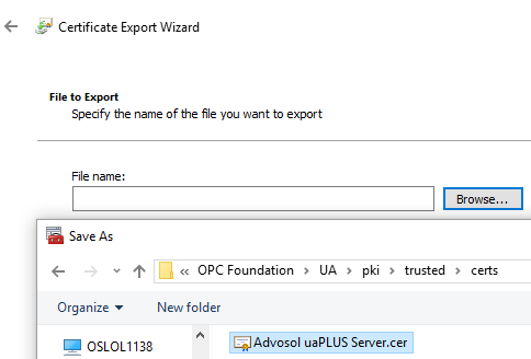 Browse to C:\ProgramData\OPC Foundation\UA\pki\trusted\certs; Enter the name of the certificate: Advosol uaPLUS Server.cer; click Save, click Next