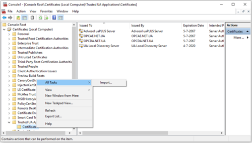 - Making the OPC UA Server trust the OPC UA Client by importing the client certificate