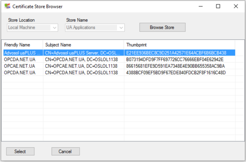 Self-signed certificates can be created with the uaPLUS UaServerConfigHelper utility. uaPLUS maintains certificates in the Windows Certificates Store.