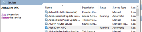 Before starting any clients make certain that the AlphaCom_OPC server is running and that the Startup Type has been set to Automatic