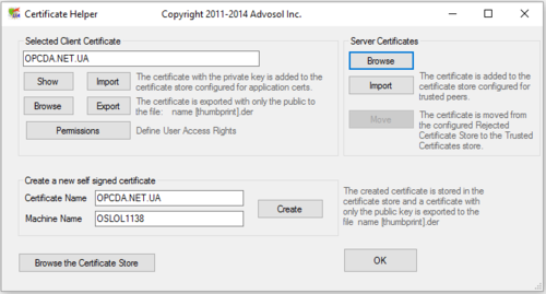 The UaServerConfigHelper utility creates and imports certificates into the stores defined in the configuration.