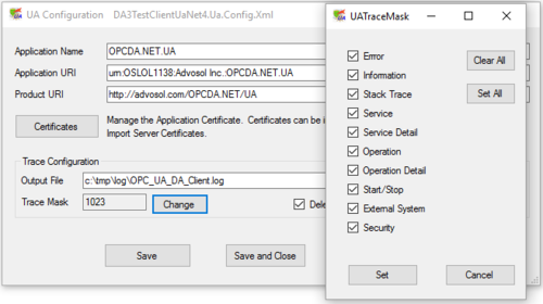 The Trace Mask can be changed by clicking the Change button. Enabling all options will set the trace mask to the value 1023 as shown above.