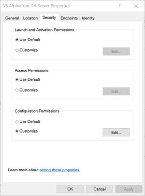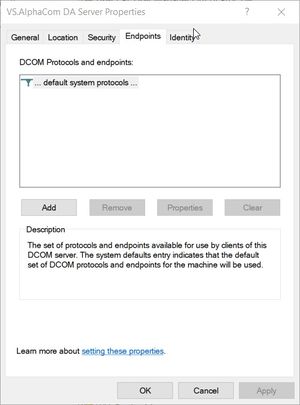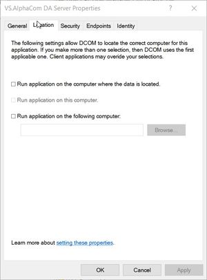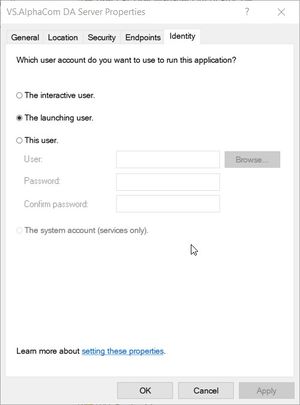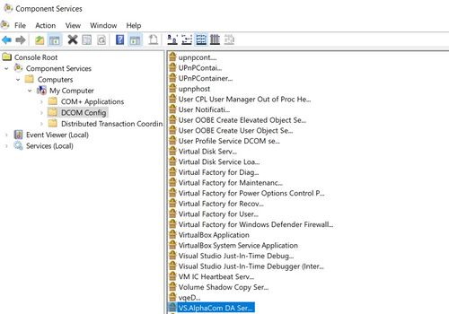 Locate the server “VS.AlphaCom DA Server” right click and select  “Properties”.