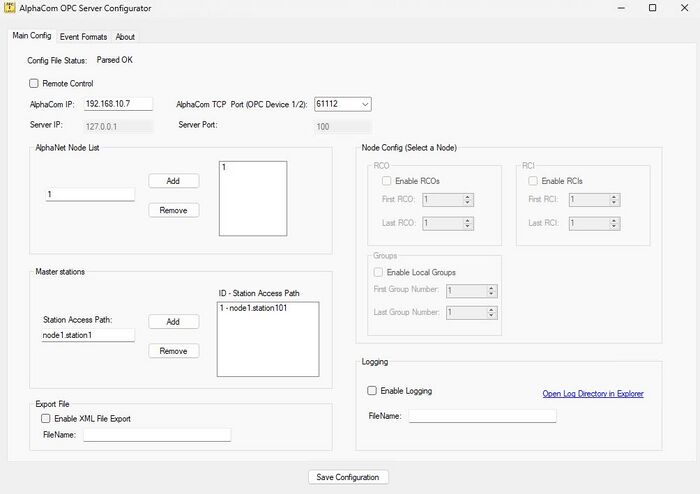 • Node config (optional): If the OPC client should control RCO's or read RCI's in the AlphaCom, the relevant RCO's/RCI's must be defined: