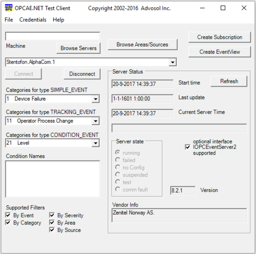 • Select Connect. The OPC client will now attempt to connect to the OPC AE Server. A successful connection is indicated by 'Server state' = Running.