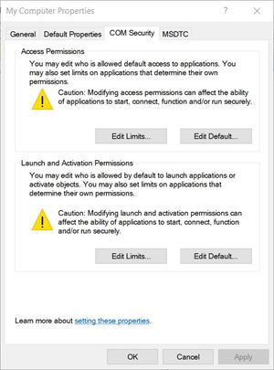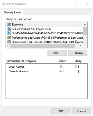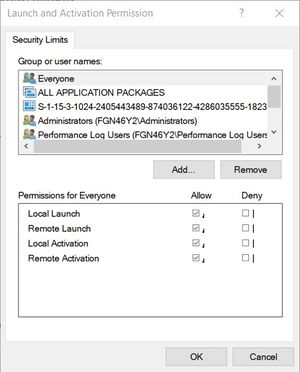 -       In the “Launch and Activation Permissions” pane, click the “Edit Limits..”-button. Add “Everyone” to the list of “Groups or user names”. Check all “Allow” permissions and click the “OK”-button.