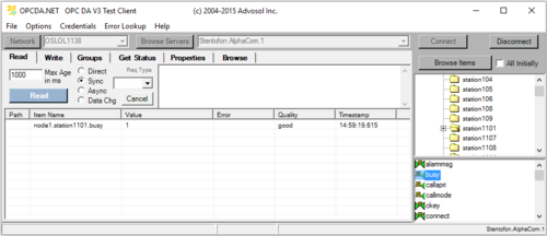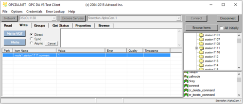 OPC DA can send (write) commands to the AlphaCom (call setup etc.), and receive status information from AlphaCom. A free test client for OPC DA is installed in the VS-OPC Classic for AlphaCom installation directory.