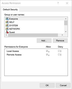 -       In the “Access Permissions” pane, click the “Edit Default..”-button. Add “Everyone” to the list of “Groups or user names”.  Check all “Allow” permissions and click the “OK”-button.