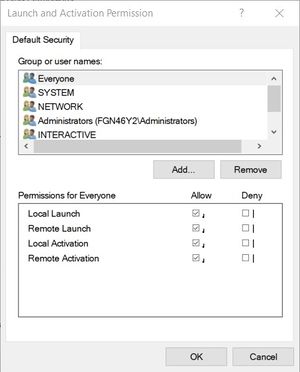 -       In the “Launch and Activation Permissions” pane, click the “Edit Default..”-button. Add “Everyone” to the list of “Groups or user names”. Check all “Allow” permissions and click the “OK”-button.