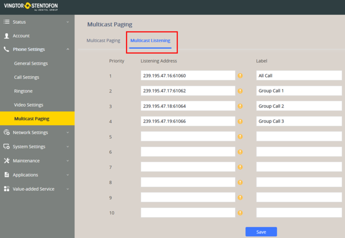 Navigate to Phone Settings > Multicast Paging > Multicast Listening tab, and enter the multicast address(es) found in the Edge Controller as indicated in the screen shot below: