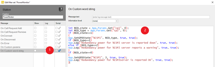 Give the Filter a name, here we are using PowerMonitor. Select On Custom word string and enable the check box for Script. As we are creating the Log messages from the script, we can leave the Show and Log checkboxes unchecked, and we do not need a message text. Copy and paste the script, press the Test button and then OK.