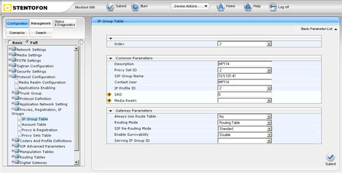 - In the "IP Group Table" page (Configuration tab -> Protocol Configuration menu -> Proxies,Registration,IP Groups submenu -> IP Group Table page):