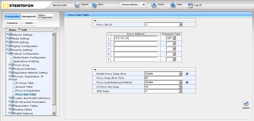 - Click the Proxy Set Table button. In the ‘Proxy Address’ field enter the IP address of the Mediant 600.