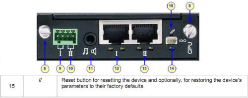 - With a paper clip, press and hold down the Reset button (located on the CPU Module) for at least 12 seconds (no more than 25 seconds)