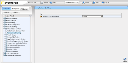 - In the "Applications Enabling" page (Configuration tab -> Protocol Configuration menu -> Applications Enabling page):
