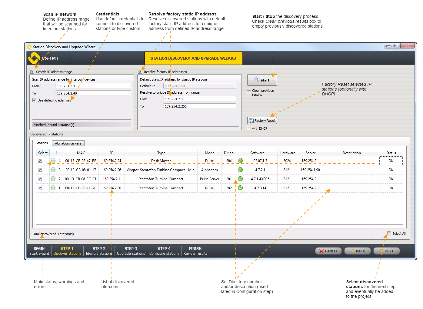 The first step is to discover which stations are connected to the network. This is done by scanning the network within a defined IP address range or by discovering the stations with a factory default static IP address and assigning them a unique IP address from a defined address range.