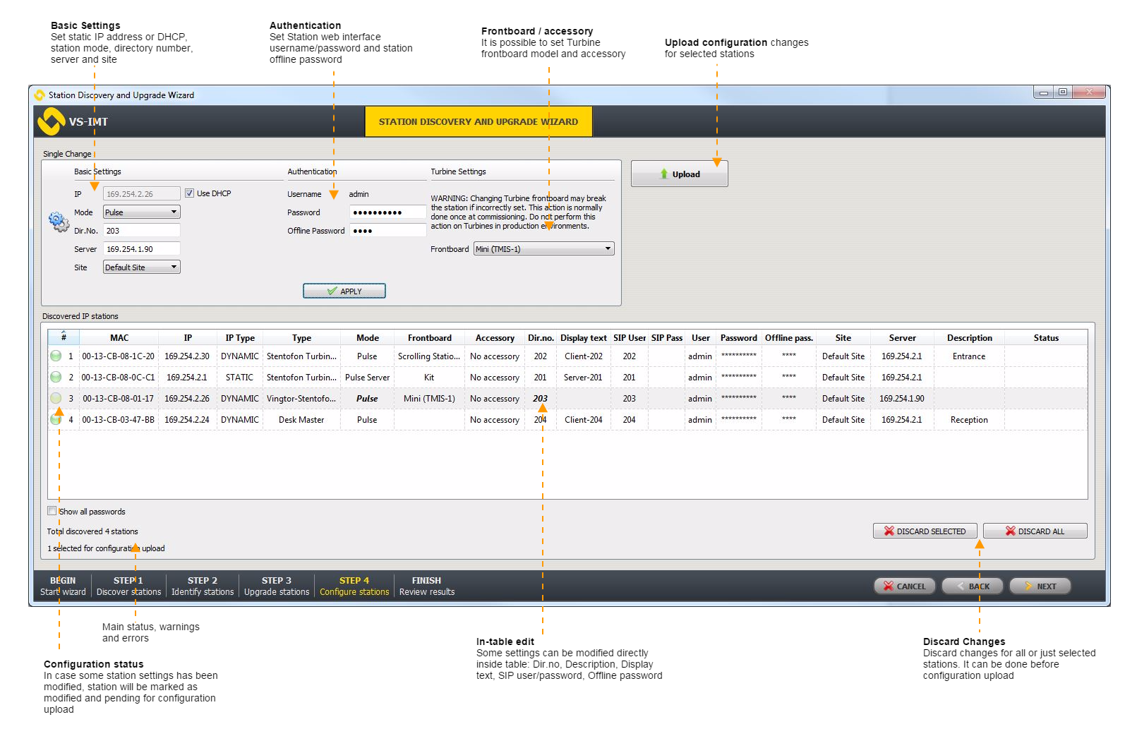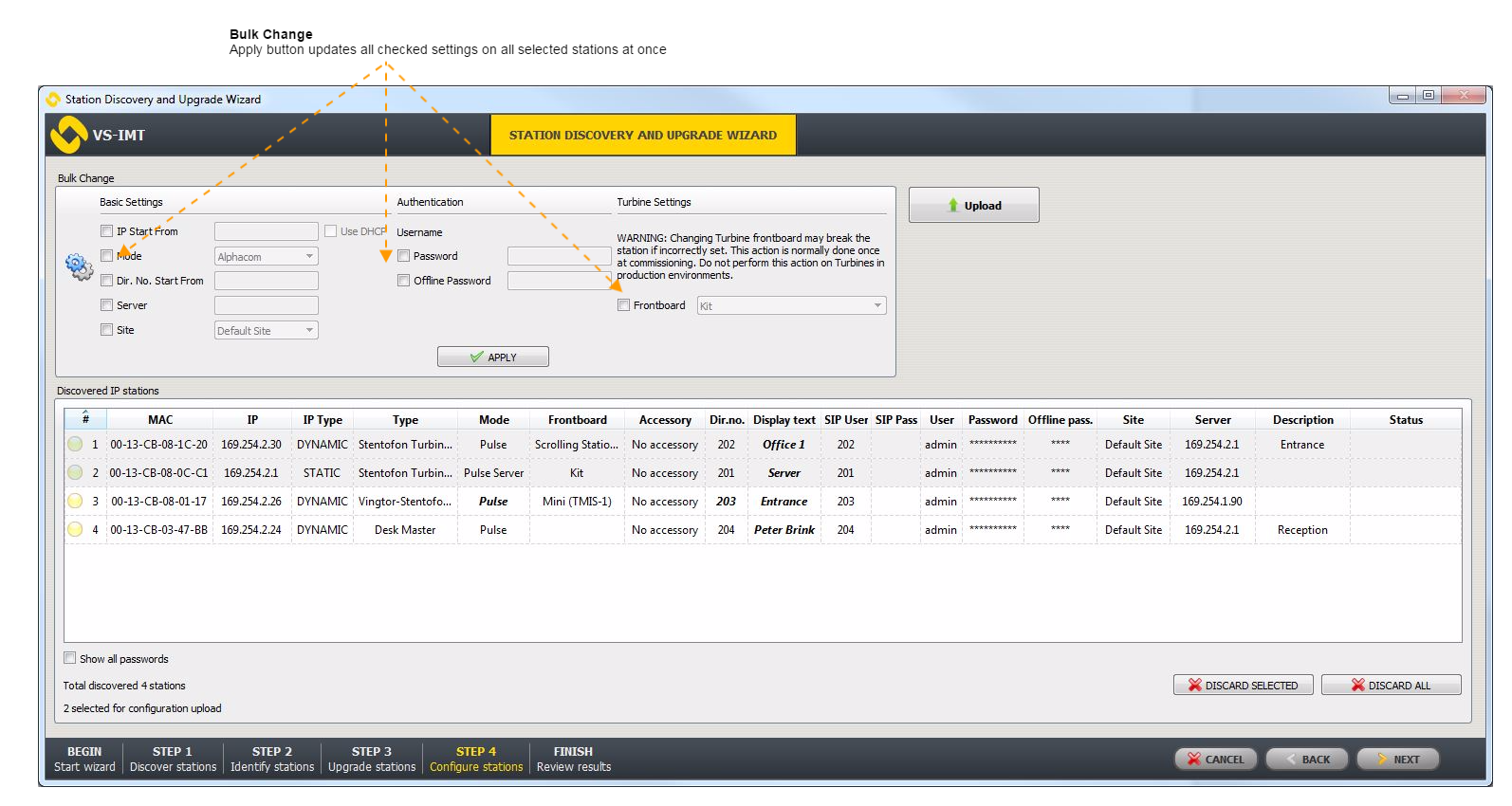 It is possible to make changes for multiple selected stations such as set multiple stations to DHCP network address, assign static IP address starting from defined IP address, assign directory number starting from defined number, set server, mode, etc.