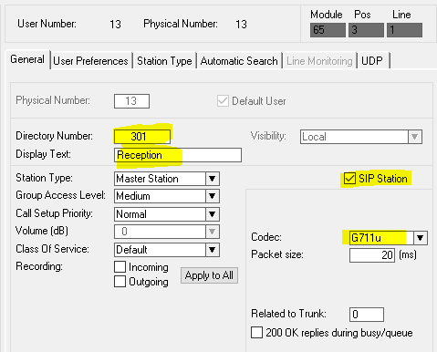 • From the Users & Stations window in AlphaPro, select a free user from the listbox, and enable the SIP Station flag
