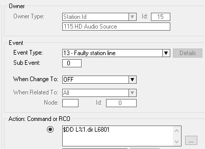 A station/device dialing feature 118 becomes the program feeder. Add an event that sets the Audio Program Source as source for program feed. Use the event 13 (Faulty Station), When Change To = OFF, and action: $DD L%1.dir L6801.