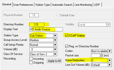 In AlphaPro, Users & Stations, enter a directory number for the Line Input and set the Noise Reduction to 0: