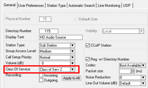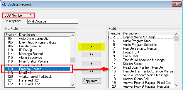 The Audio Program Source must be allowed access to feature 118. To avoid any other station/device dialing the directory number for the feature, it is advisable to define a separate COS for this feature. Add feature 118 to this Class of Service (CoS #2 in the example below).