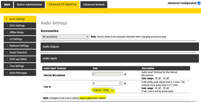 To use the TKIE-kit as Audio Program source, enable Line In. A reboot of the TKIE kit is required for the change to take effect: