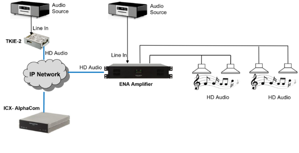 The Line Input channel of the ENA Amplifier (or the TKIE-2 kit) must register to a directory number in the ICX-AlphaCom server.