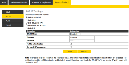 The 802.1X configuration is done from the ICX-Alphacom web interface at System Configuration > 802.1X.