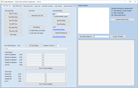 The Turbine Test and Demo Application is a PC application that allows you play audio files directly from the Turbine station without connection to any server. It also allows you to do audio recordings to be used for trouble shooting if there are issues related to audio in the Turbine station.