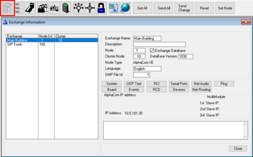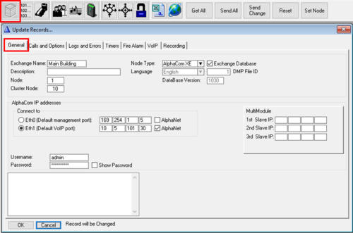 - Node: 1 - 254. Default node number is 1. The node number is used for communication between AlphaCom servers in AlphaNet. The node number was choosen when the database was created. Can be modified from the "System" window.