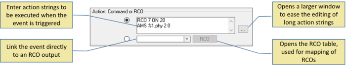 - When the upper radio button is selected, you can write action commands which will be executed when the event is triggered. One command per line.