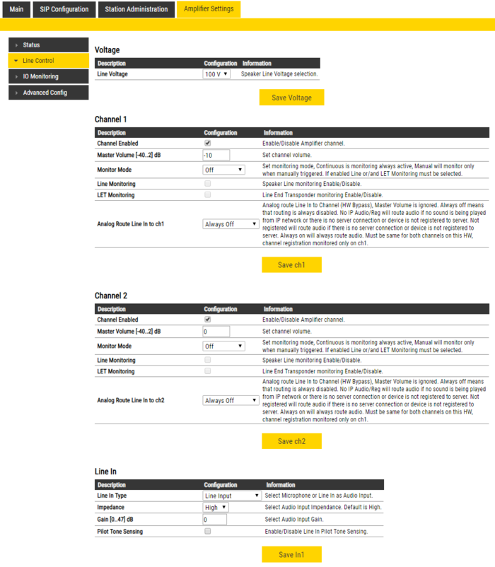 - Line Voltage choose speaker line voltage - 70V or 100V options