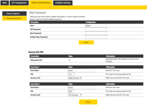 There is also an option to set a pin code for the Device GUI. A Read only-user and a Full Access-user can be enabled, or changing settings from the GUI can be disabled entirely.