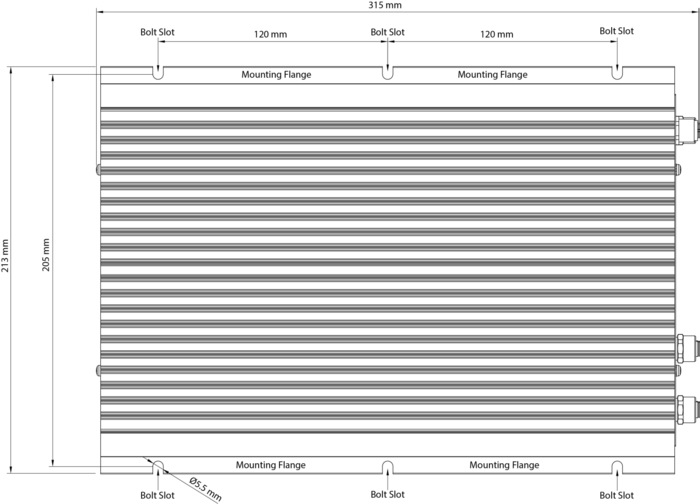 - Secure the amplifier to the mounting surface by fastening the bolts in the slots on the mounting flanges (see Figure 1: Mounting Measurements)