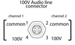 The Audio Line / Speaker connector is a 4-pin M12 A-Coded female connector that has two channels with 100-volt output per channel.
