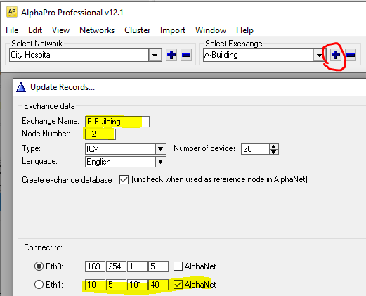 Create a customer database and define the first ICX-AlphaCom node by clicking the + sign as highlighted below.
