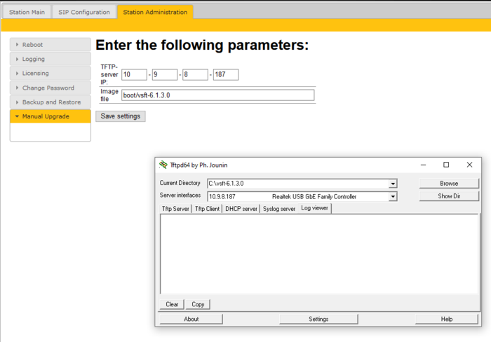 - The station will now contact the TFTP server and download the files. The upgrade procedure takes about 3 minutes. The process can be monitored by clicking the Log viewer tab in the TFTP server program.