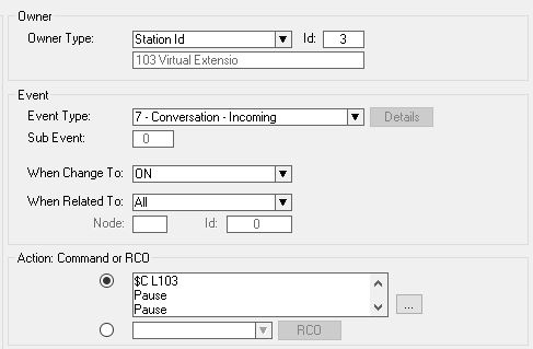 On answering the Virtual Extension, we need to divert the call to the Real Extension. Add an Event to the Virtual Extension to cancel the call at Virtual Extension 103, and connect Control Room 101 to Real Extension 102