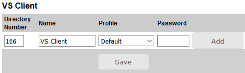 - Under VS Client enter the Directory Number, Name, and Profile for the client.
