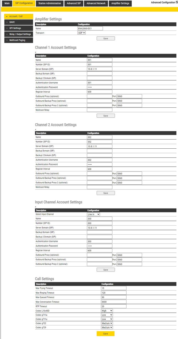 For a more detailed description of various settings and options, see ENA Amplifier Web interface - SIP mode.