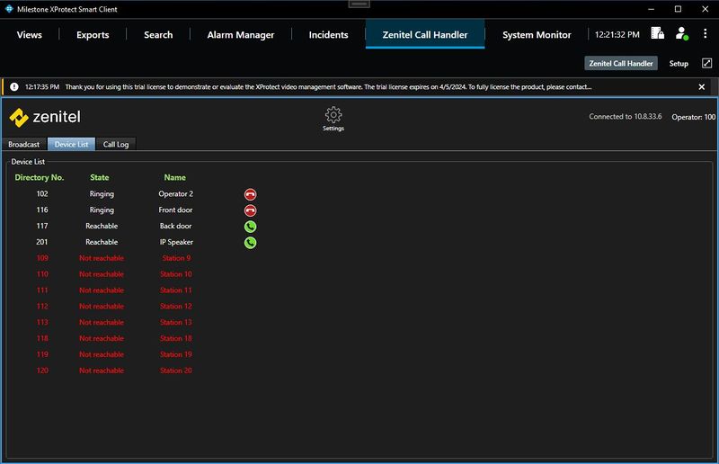 2. Return to Milestone XProtect and within the Zenitel Call Handler, navigate to the 'Broadcasting' tab.