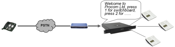 - Example: ”Welcome to Procom Ltd, press 1 for switchboard, press 2 for Sales department, press 3 for Marketing department, or wait for an answer”