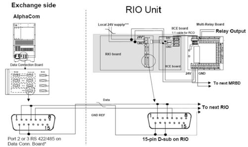 The exchange and the RIO communicate using messages in AlphaCom data protocol format. The messages are transported to the RIO over ISO 1745, which is a communication protocol for a multidrop bus.