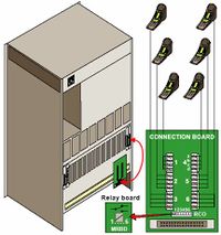 Intercom stations and control outputs are connected to a connection board mounted on the exchange connection field. 2 pc subscriber connection boards (100 9930 200) with 1.5 m connection cables (100 9501 011) are delivered with the exchanges.