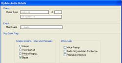 The Audio event is intended for PA control or mobile radio keying, that is, as an extension to the audio function of the 'owner' station. Normally the action for this event is the operation of a RCO. The Audio event is divided into a number of sub-events, which are closely related to each other, and which can be combined to operate the same RCO. UDP groups cannot be used with Audio events. Audio events are not associated with a "When Related to" number. In AlphaPro the sub-events can be selected after clicking the 'Details'-button.