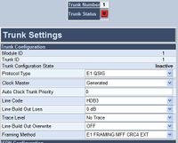 In Advanced Configuration > Trunk Settings you specify the properties of the trunk line. Select the protocol to be used for the trunk (Protocol Type), the trunk clock source (Clock Master), Line Code and physical framing to be used (Framing Method), and other relevant parameters.