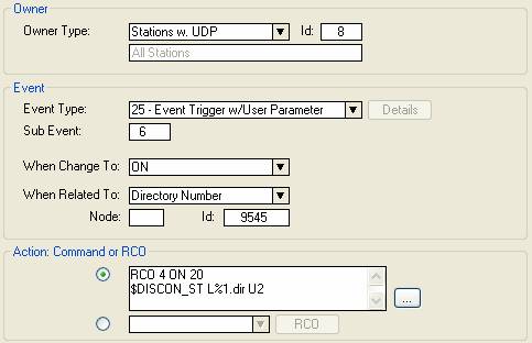 When the operator gets a signal that there is someone at the door he should dial a 'dummy' number, then press digit 6 to operate a relay output (i.e. a RCO). In the example below any station can dial 9545 + 6 to trigger RCO 4 for 2 seconds, and disconnect with success-tone. Use the two-step event trigger, feature 105.