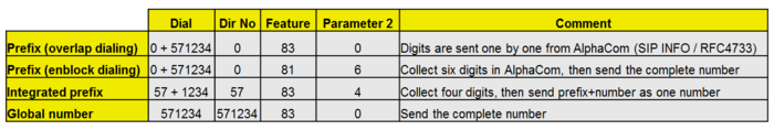 - Prefix number: Dial Prefix + Phone number. One can choose to send digit by digit (overlap dialing), or collect all digits in the AlphaCom and send the complete phone number with the INVITE message (enbloc dialing)