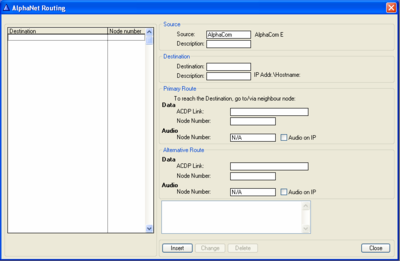 | Base Address | First multicast address used by this node. Default is empty. If empty the address 239.192.nnn.0 is used, where nnn is node number. Usually this default can be used. Only need to be changed if conflicts with other multicasting applications on the same net. Alphacom may use up to 31 adresses following the base-address. These adresses are used for group call, program conference and audio program to IP stations. |